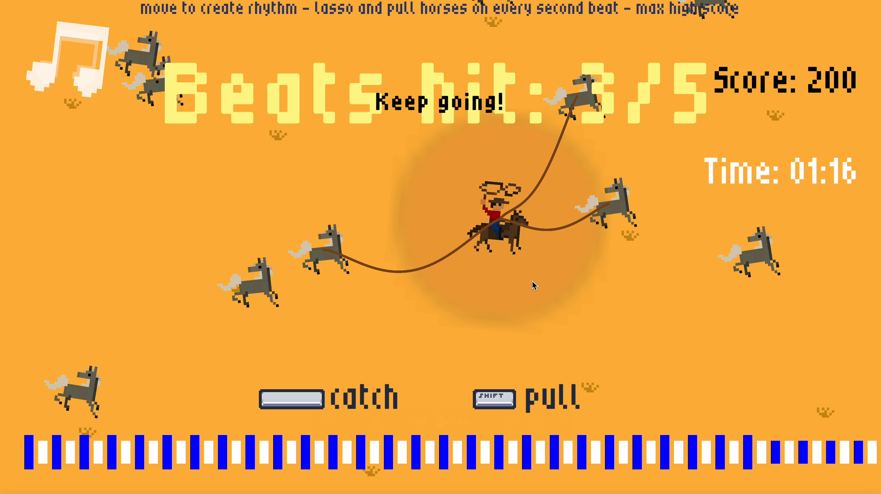 - Press SPACE on the beat to catch horses with your lasso